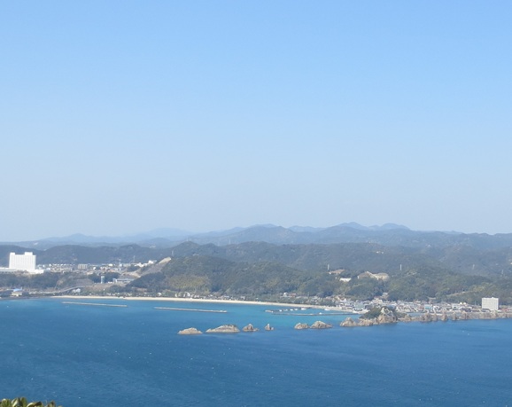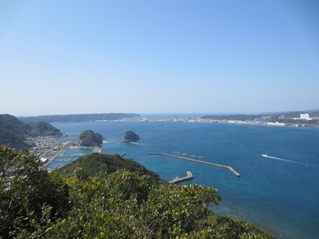 登り始めは亜熱帯特有の樹木に覆われていて薄暗いですが、途中から尾根道に入ると見通しが良くなり、紀伊大島の街並みや、海を隔てて橋杭岩・串本の市街地が見えてきます。